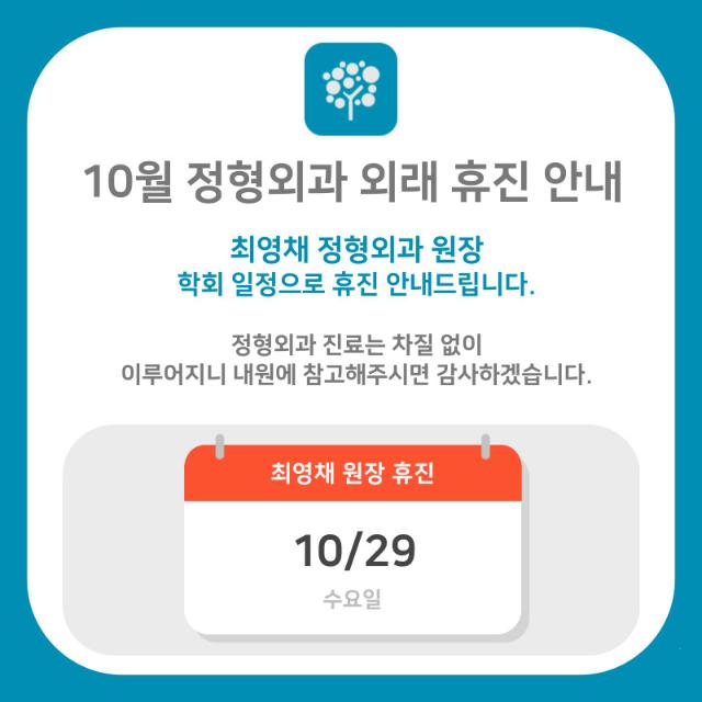 10월 29일 (수) 정형외과 최영채 원장님 학회 일정으로 휴진 안내드립니다.